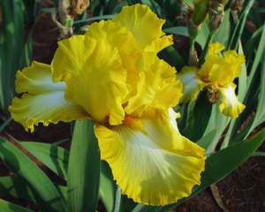 Beard: The fuzzy part of lower petals on bearded iris Falls: The three lower petals Plicata: Speckled, stitched or flecked with another color Self: An even color throughout Signal: The spot of color replacing beard on beardless irises Standards: The three upright petals of the flower Styles: Extend from the throat of the flower |