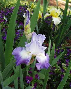 Beard: The fuzzy part of lower petals on bearded iris Falls: The three lower petals Plicata: Speckled, stitched or flecked with another color Self: An even color throughout Signal: The spot of color replacing beard on beardless irises Standards: The three upright petals of the flower Styles: Extend from the throat of the flower |