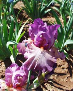 Beard: The fuzzy part of lower petals on bearded iris Falls: The three lower petals Plicata: Speckled, stitched or flecked with another color Self: An even color throughout Signal: The spot of color replacing beard on beardless irises Standards: The three upright petals of the flower Styles: Extend from the throat of the flower |
