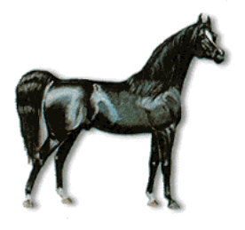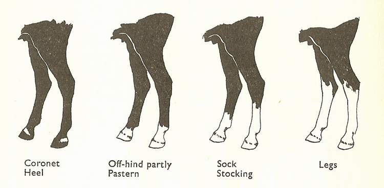 The entire coat, including the muzzle, flanks, and legs, must be black with the exception of white markings. If any doubt arises between black and dark bay, black can be determined by noting the fine black hair on the muzzle.
