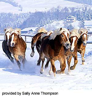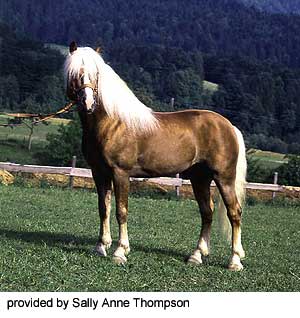 Uses: Ideal for forestry work, pulling and carrying loads on steep hillsides. Also ridden, and driven in harness. Pairs are used to pull sleighs up the snowy slopes at St. Moritz, with red harness and silver bells setting off their chestnut coats and flaxen manes and tails. Ideal pack animal for mountain troops.