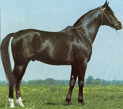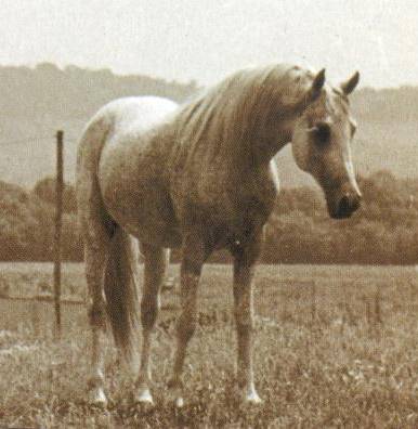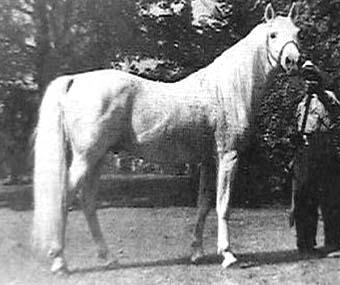Profiles: Skowrenek - One of the most famous Arabian sires of all time; bred in 1909 at Volynia; a dazzling white horse with the long curved neck, huge eyes and "dished" profile that characterizes the best of his breed. The stallion was imported to England, sold to a Mr. Musgrave Clark and eventually seen by Lady Wentworth who owned the renowned Crabbet Park Arabian stud. She was so entranced with the horse's beauty and potential that she did not rest until Skowrenek was installed at Crabbet--where he is said to have founded a new dynasty of Arabian horses.