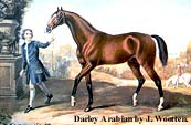 The second of the three was a magnificent bay with a white blaze down his face and three white feet. A traveling merchant named Thomas Darley discovered him in the Syrian desert. By some power of persuasion he did the impossible; he convinced an Arab tribe to sell the stallion. And before the Arabs could change their mind, the handsome bay was bound for Buttercramp in England. (At least one source states that he was bought in Aleppo, Syria, which would coincide with this story.) He arrived in England in 1700, at the age of four. Descendants of the Darley Arabian are renowned for their swiftness. I have even heard that this horse might have been a Turkmen horse! (Note: Something I just read implied that even the "Barb" and "Turkmen" horses are descendants of the Arab. I really have to object to this, but since I really am not on expert on genetics, I will wait to say more!)