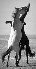 A stallion rears up to intimidate a rival, often lashing out with its front feet. Horses also rear up in play.