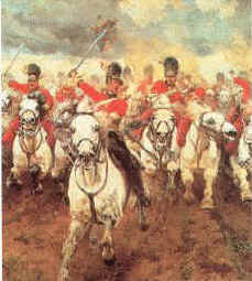 During World War I, millions of horses were used on all parts of the front, and losses were appalling. The Scots Greys arrived at the Belgian frontier soon after the outbreak of war, and the famous grey horses had to be stained chestnut in order to camouflage them and prevent the enemy identifying their formation. The painting is a centre detail of Scotland Forever by Lady Butler, showing the charge of the greys at Waterloo.