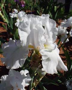 Beard: The fuzzy part of lower petals on bearded iris Falls: The three lower petals Plicata: Speckled, stitched or flecked with another color Self: An even color throughout Signal: The spot of color replacing beard on beardless irises Standards: The three upright petals of the flower Styles: Extend from the throat of the flower |