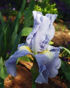 Beard: The fuzzy part of lower petals on bearded iris Falls: The three lower petals Plicata: Speckled, stitched or flecked with another color Self: An even color throughout Signal: The spot of color replacing beard on beardless irises Standards: The three upright petals of the flower Styles: Extend from the throat of the flower |