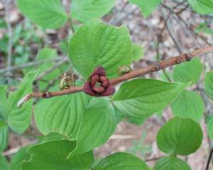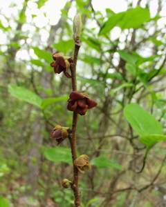 A low, slender, often bushy, native shrub. The thin leaves, odorus when bruised, are obovate, often 6 - 8 inches long, and appear after the maroon, 3-parted, 1 - 1 1/2 inches broad flowers. The fleshy, fragrant fruit, 2 - 3 inches long, is edible. A native of the eastern U.S., these trees are infrequently found in low woods at scattered localities throughout the state. March - May [Justice, William S. and Bell, C. Ritchie, Wild Flowers of North Carolina. University of North Carolina Press, Chapel Hill, 1968]
