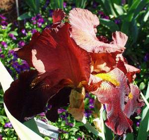 Beard: The fuzzy part of lower petals on bearded iris Falls: The three lower petals Plicata: Speckled, stitched or flecked with another color Self: An even color throughout Signal: The spot of color replacing beard on beardless irises Standards: The three upright petals of the flower Styles: Extend from the throat of the flower |